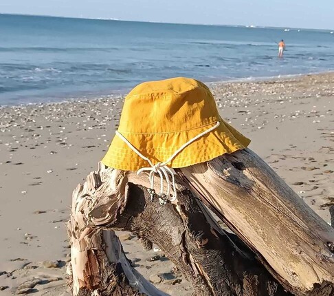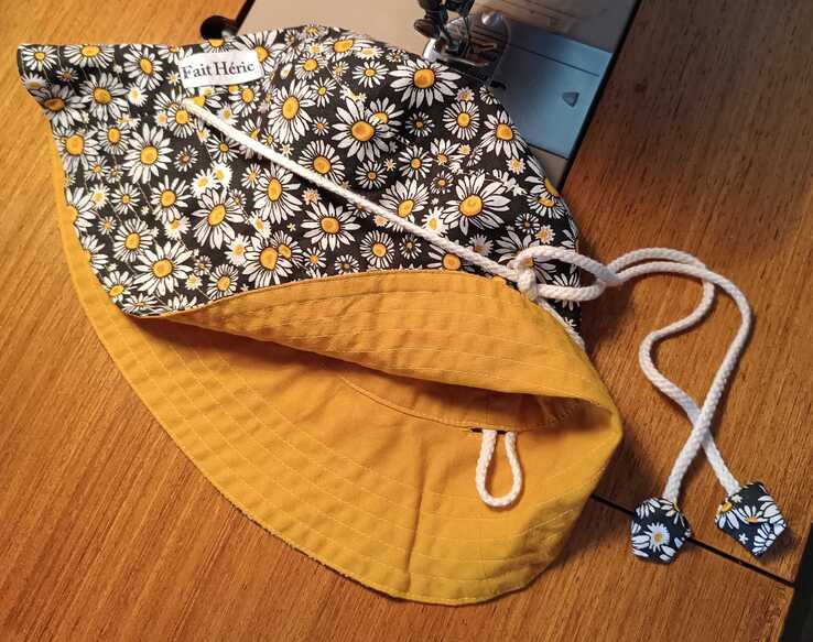Ce bob upcyclé en tissu 100% coton au motif marguerites est une pièce unique, indispensable en période d’été mais aussi en mi-saison. Vous pouvez le porter côté uni ou côté motif car ce modèle est réversible. Il a des liens pour le maintenir en place quand il y a du vent, noté que les liens peuvent être d’un côté à l’autre par des petites fentes prévu à cet effet. Voir photos n°3