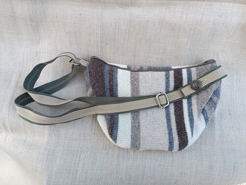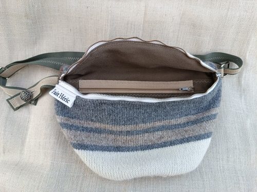 Sac banane fait main, que j’ai créé à partir de tissus revalorisés. Vous croiserez sûrement d’autres modèles comme une casquette, un portefeuille, une blague à tabac, … qui porteront fièrement ses couleurs.