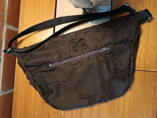 Sac fait main, que j’ai créé à partir de tissus revalorisés. Vous croiserez sûrement d’autres modèles comme une casquette, un portefeuille, une blague à tabac, … mais tous en pièce unique.