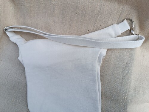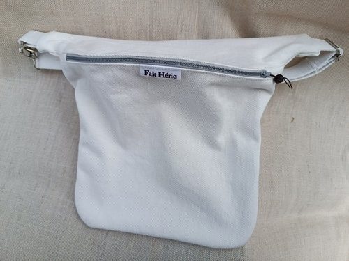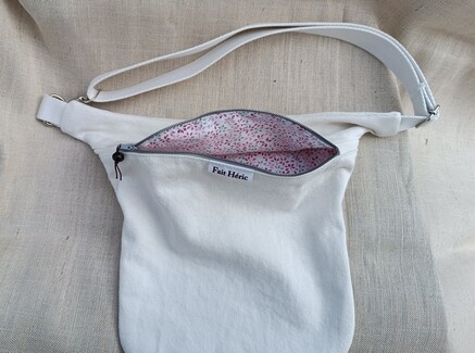 Sac de hanche artisanal upcyclé confectionné dans un coton épais blanc, ce modèle comporte le devant d’un sac banane pour lui donner une ampleur d’ouverture plus grande . La sangle se ferme par un mousqueton  avec une ampleur de réglage de 84cm à 114cm pour être portée en bandoulière comme à la taille.