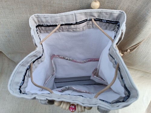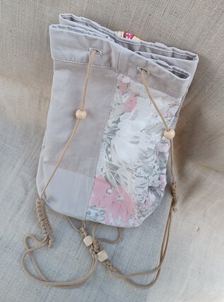 Ce sac seau beige et fleuri rose pâle artisanal est né à partir d’un pantalon et d’un coupon de tissu. Pratique avec sa poche zippée ainsi que sa poche passepoilée devant et ses 4 poches intérieures pour y glisser ses clés et plein d’autres choses à garder sous la main. Il se referme grâce à ses bretelles en macramé ornés de perles en bois. Il peut se porter comme un sac à dos ou sur l’épaule.
