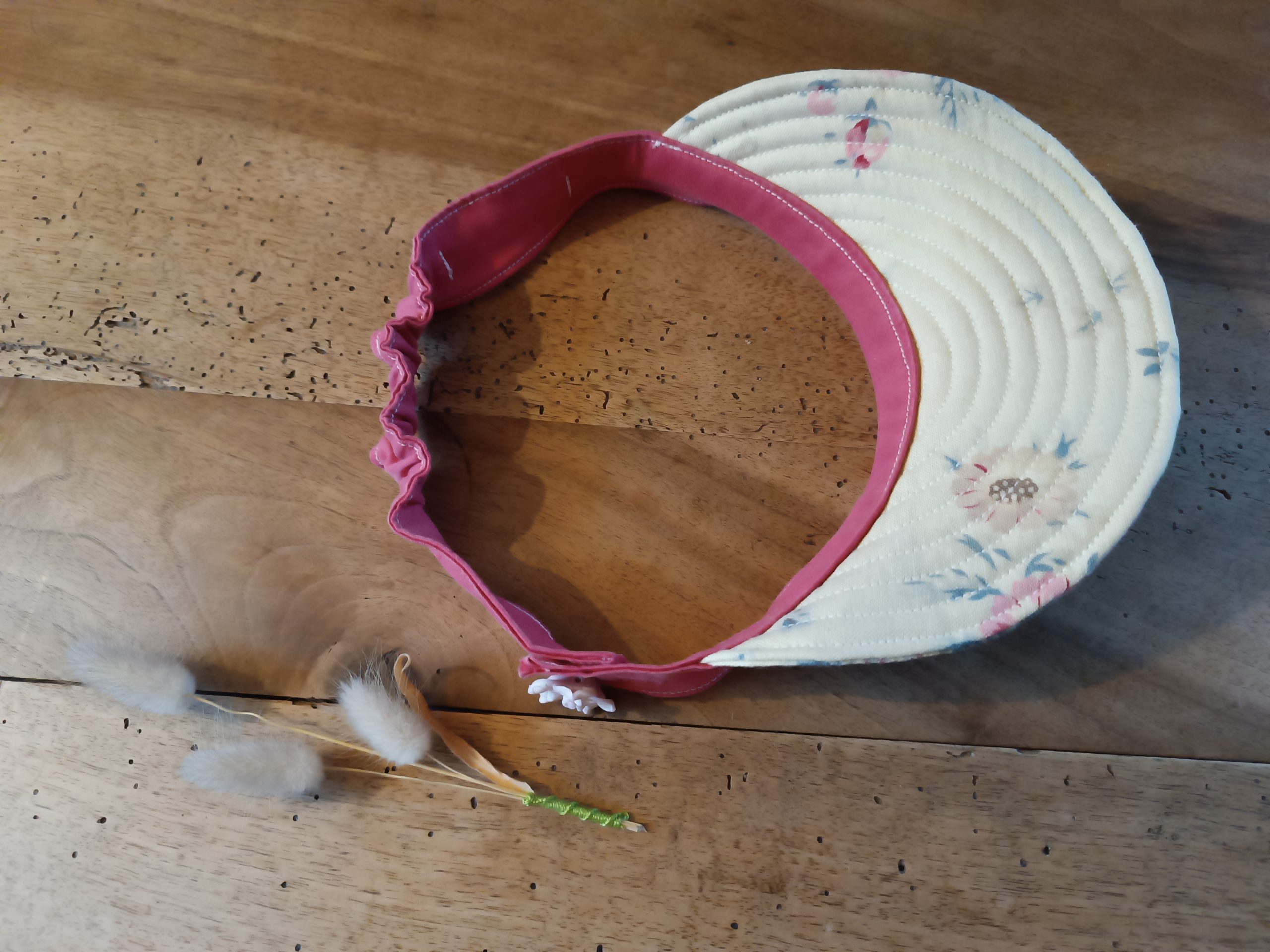 Indispensable en période d’été mais aussi en mi-saison cette visière en tissu 100% coton rose et fleuri est une pièce unique.